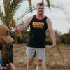 Man wearing a black t-shirt with 'RANGE DAY' text, sunglasses, and a cap in an outdoor setting.