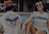 Person wearing American flag swim shorts with a grunt style logo in the corner.