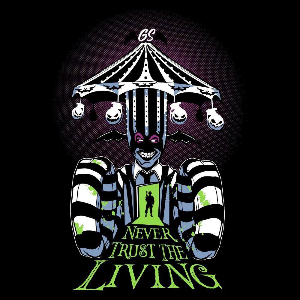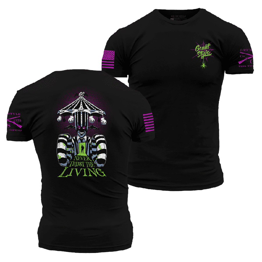 It's Show Time and this Never Trust The Living T-Shirt is perfect for those who embrace the strange and unusual! This shirt is sure to spook and excite, just don't say his name three times! This spooky design boasts a badass design that is sure to get noticed and stand out this spooky season.