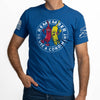 Light blue shirt with red, white, and blue graphics and text on a white background