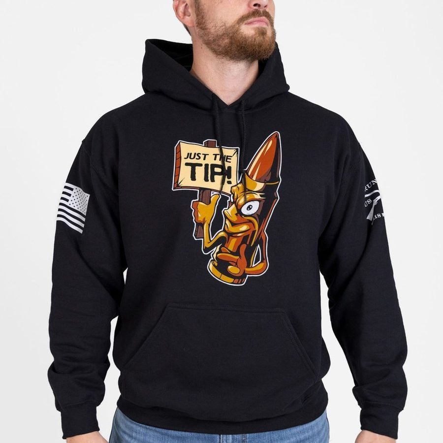 It’s more than a joke—it’s a statement. A reminder that when it comes to defending freedom, you're always on target. The Just The Tip Hoodie in Black brings that bold-as-hell Grunt Style attitude you love with a shot of cold-weather comfort. Featuring our iconic bullet graphic and that cheeky line that never misses, this hoodie is built for patriots who pack heat and punchlines.