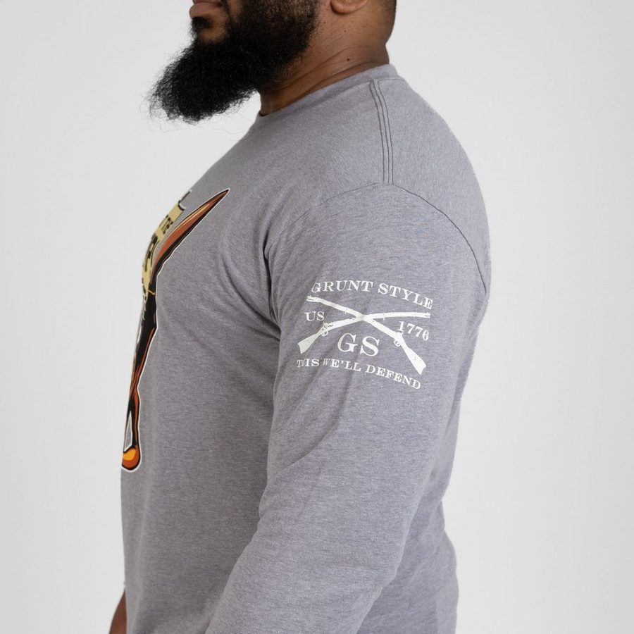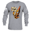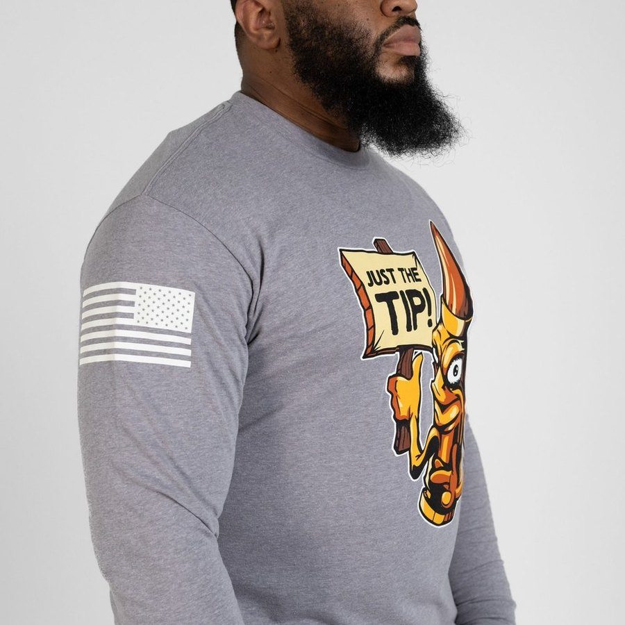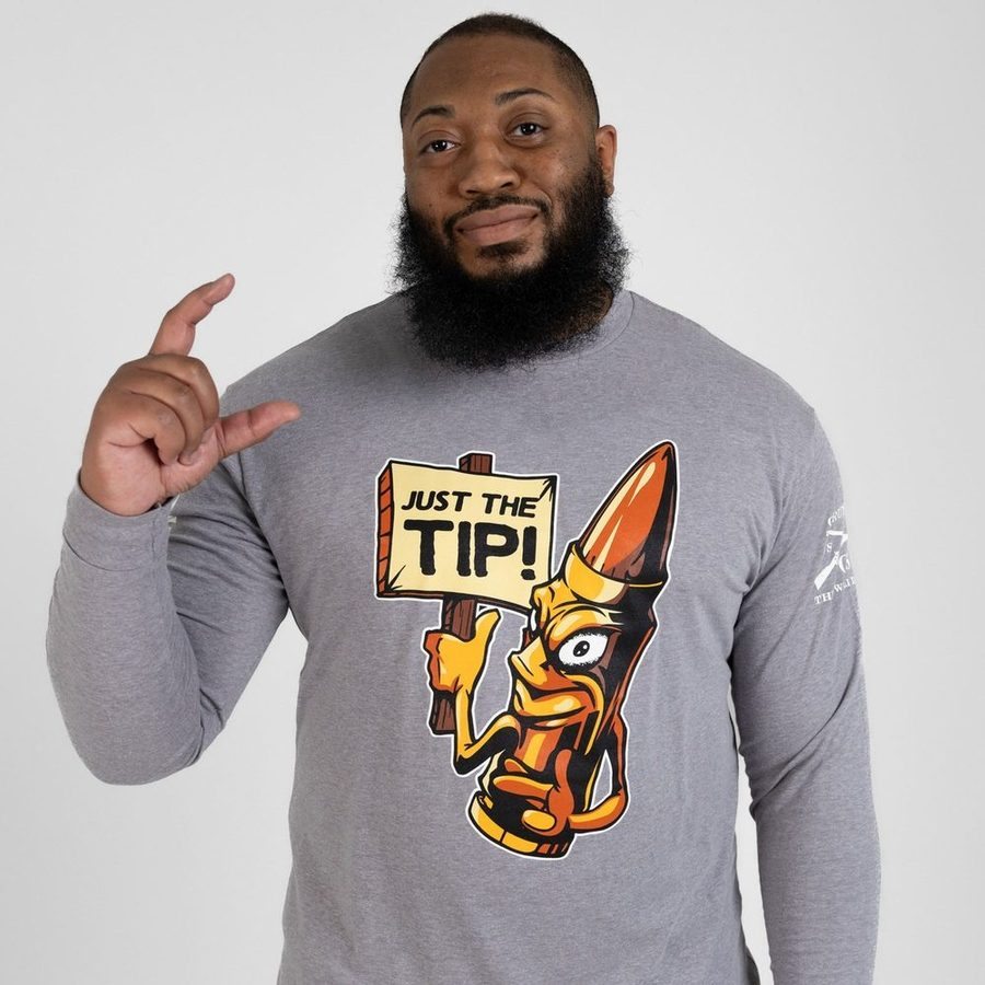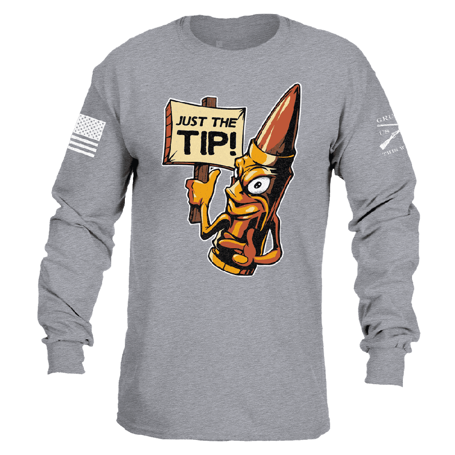 Same savage attitude—now with long sleeves. The Just The Tip Long Sleeve in Dark Heather Gray brings the heat with cold-weather coverage and a shot of dark humor straight from the ammo can. Featuring a bold bullet graphic and that infamous line, this one’s for the patriots who shoot straight and joke sharper.