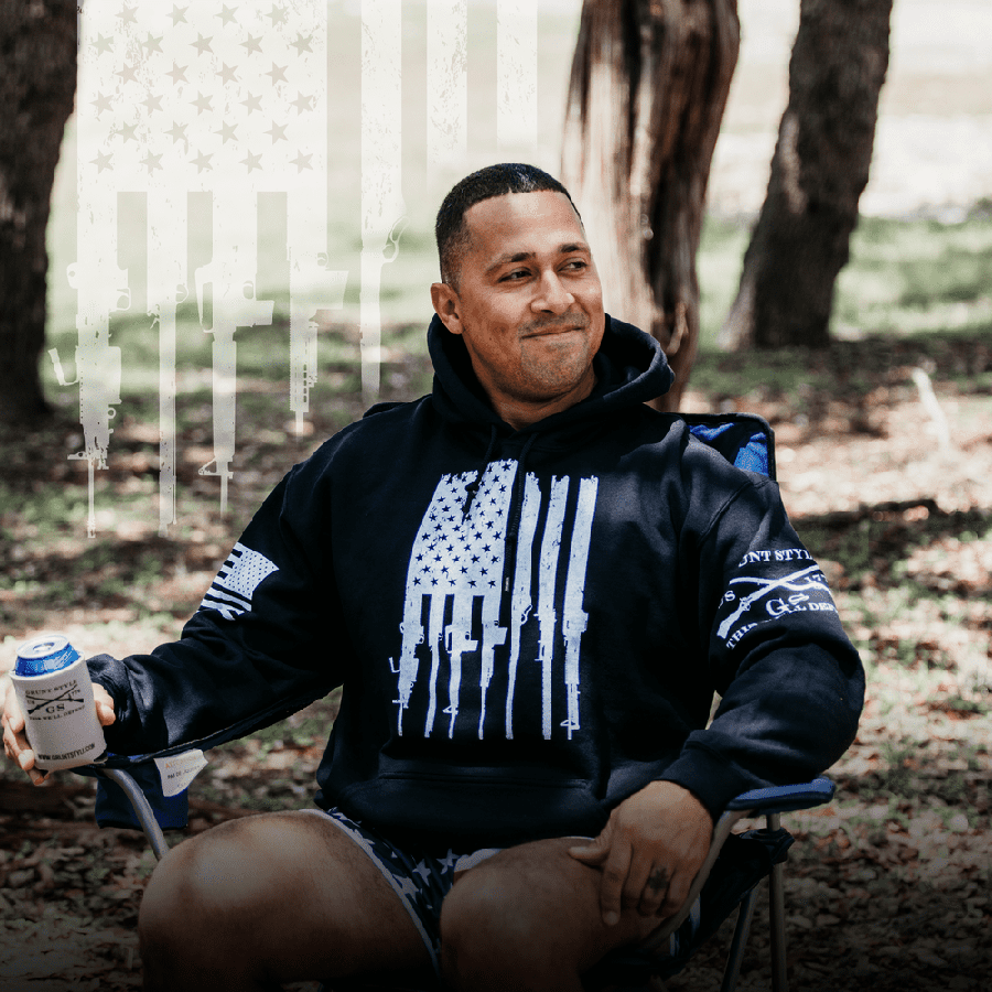 The right to carry and bear arms is an American right. Celebrate the 2nd Amendment of the United States Constitution, "the right of the people to keep and bear Arms, shall not be infringed." Whatever your choice of firearms is, show your love of the Second Amendment and get your Rifle Flag Hoodie today!!