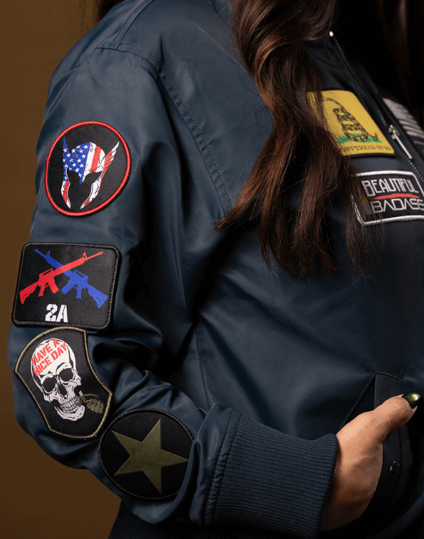 Unleash your adventurous spirit with our Women's Classified Bomber Jacket in navy! Not only is this jacket timeless, but it also proudly showcases all your favorite patches. Take it anywhere and embrace your badass personality. Feel bold and empowered with this essential piece.