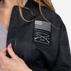 With a classic flight jacket silhouette, tactical vibes, and subtle patriotic hits, this piece is a tribute to the strong women who walk tall and carry the American spirit with them.