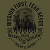 Introducing our powerful Mission First T-Shirt in Military Green, designed for those who embody courage and resilience. Featuring the inspiring mantra "Ready, Resilient, Relentless," this shirt is perfect for warriors in all walks of life.