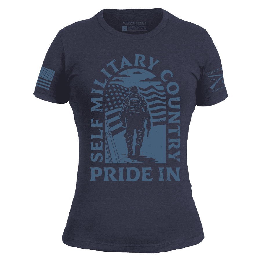 The Women's Patriot March Slim Fit T-Shirt in Midnight Navy is perfect for showing your patriotic pride. Made with Grunt Style's classic design, this top is both comfortable and stylish, making it a perfect addition to any wardrobe.